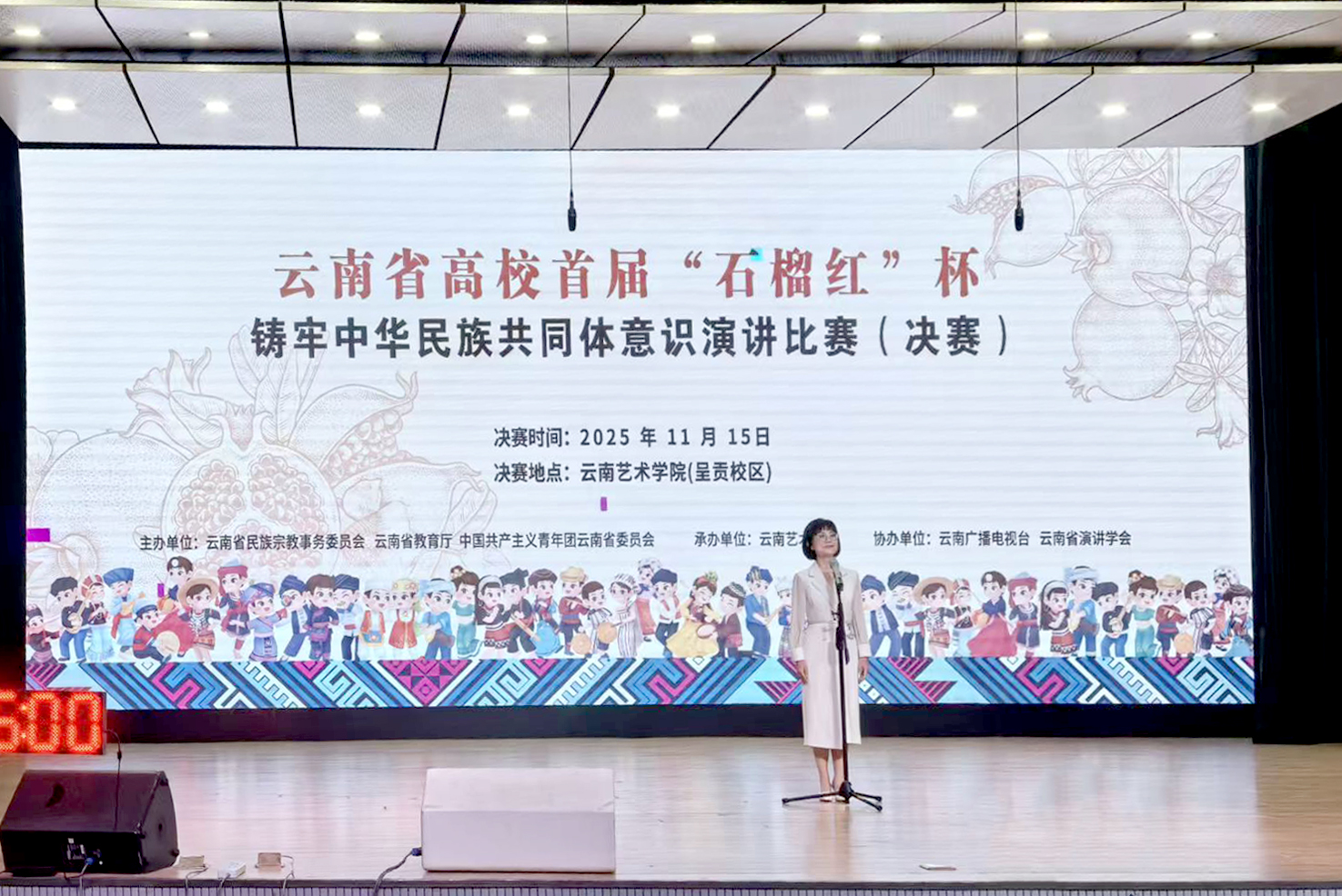 11月15日,由省民族宗教事务委员会、省教育厅、团省委共同主办的全省高校首届“石榴红”杯铸牢中华民族共同体意识演讲决赛在云南艺术学院举行。beat365官网旅游学院董芸老师经过激烈角逐,荣获二等奖。