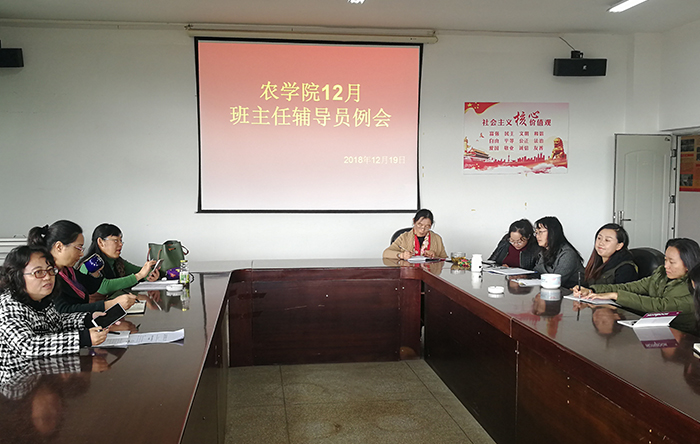 12月19日,农学院于农学楼1601会议室召开12月辅导员、班主任例会暨2018年就业工作推进会。会议由党总支副书记杨丽华主持,党总支书记郭丽红及全体辅导员、班主任参加会议。