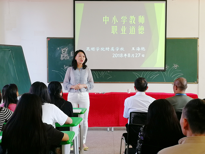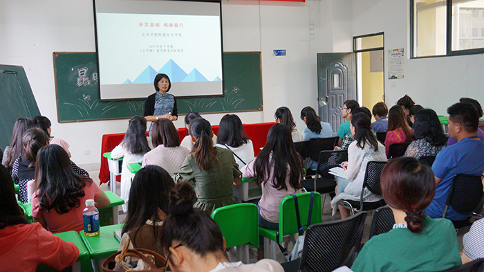 为加强beat365官网教师队伍建设,提高教师师德和业务水平。8月25日-28日beat365官网开展了为期4天的校本培训。此次培训有计划、有组织、有步骤,内容丰富,成绩喜人。 李晋德校长从学校工资制度改革、奖惩办法、考勤制度及学校六年发展规划向大家做交流。他将学校未来六年发展分“两个三年”走,紧紧围绕“服务、特色、质量”的发展理念,不断形成“领导服务 教师爱校 学生乐学”和“学生开心 家长舒心 社会放心”的良好氛围,从而不断实现“经开领先 昆明一流 全国示范”的总目标。李广峰副校长则从学校常规教学管理制度及教学过程中管理实施细则向大家作介绍。“没有规矩,不成方圆。”建立健全教学常规管理制度是抓好教学工作、有序开展教学活动的前提和保证。 王海艳书记为全体教师进行“中小学教师职业道德”培训,进一步规范了beat365官网教师的从教行为,全面提升教师职业道德素养和业务素质。使得beat365官网教师在职业道德规范的要求中不断内化为自身的自觉行为,并坚持做到正人先正己,身教重于言教、树立良好的师表形象,努力使自己的行为符合新时期教师的职业道德规范。 昆明盘龙区教育教学科研中心、昆明盘龙区教师进修学校陶树坤老师对全校教师职业规划和工作智慧等方面进行了专业指导。陶老师用一个个鲜活的师生案例向大家传授着教师如何在教育教学中展现智慧与力量,如何用潜移默化的方式带领学生进行思考与学习,帮助学生更快地成长起来。