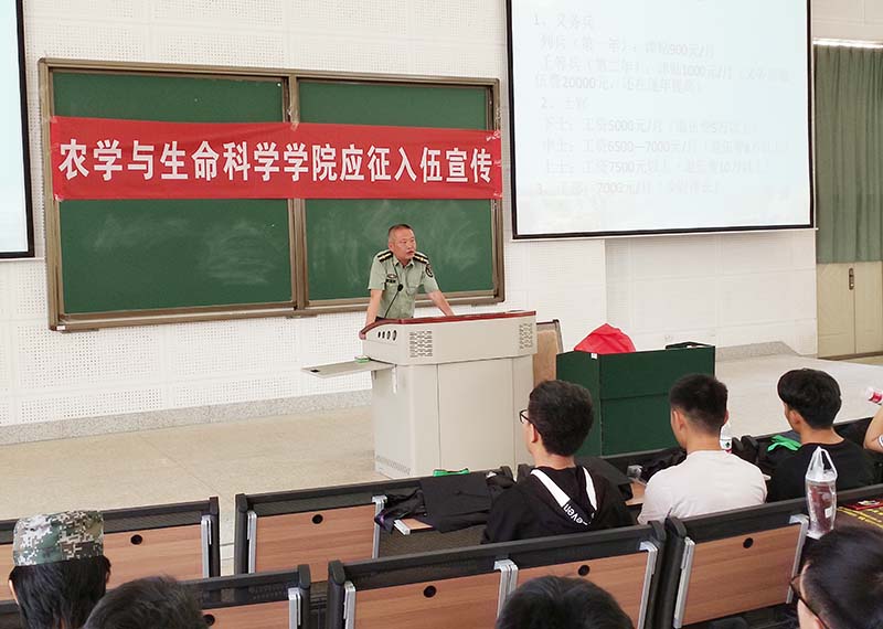 5月14日,为鼓励毕业生投身国防事业、积极参军入伍,农学与生命科学学院于在博雅楼3101教室,召开2019年应征入伍宣讲会。