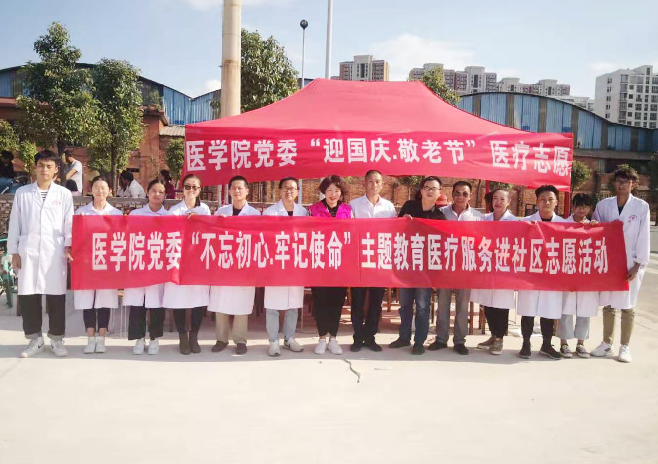 为庆祝中华人民共和国成立70周年,医学院于9月30日开展 “不忘初心、牢记使命”主题教育,全体师生党员于下午2点赴昆明市官渡区羊甫社区参加“迎国庆 敬老节”医疗志愿服务活动。