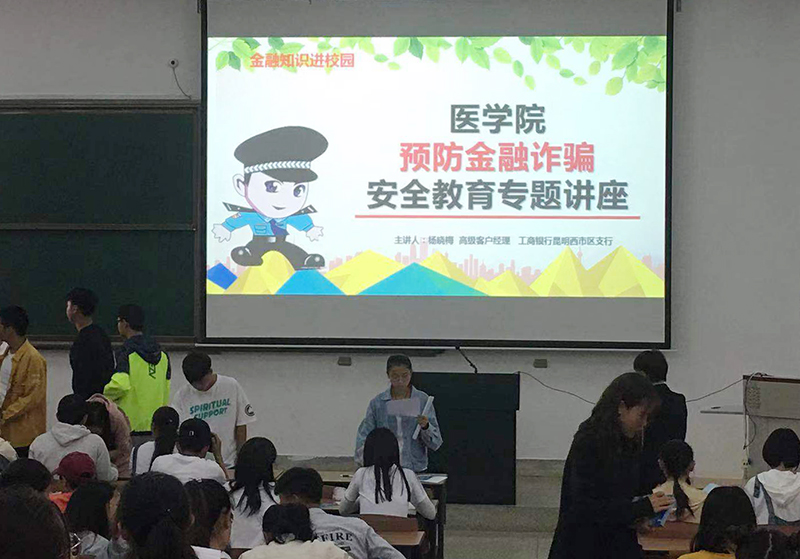 10月11日下午,在学校学生处的大力支持下,医学院邀请了中国工商银行昆明西市区支行高级客户经理、金融理财师杨晓梅为学生会干部、班干部、团干部、宿舍舍长及部分学生代表共计180多人进行《金融安全进校园,防范诈骗我帮忙》专题讲座。