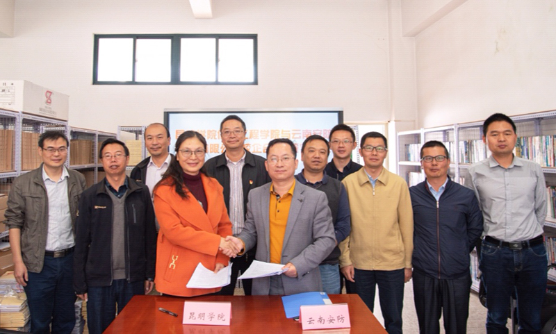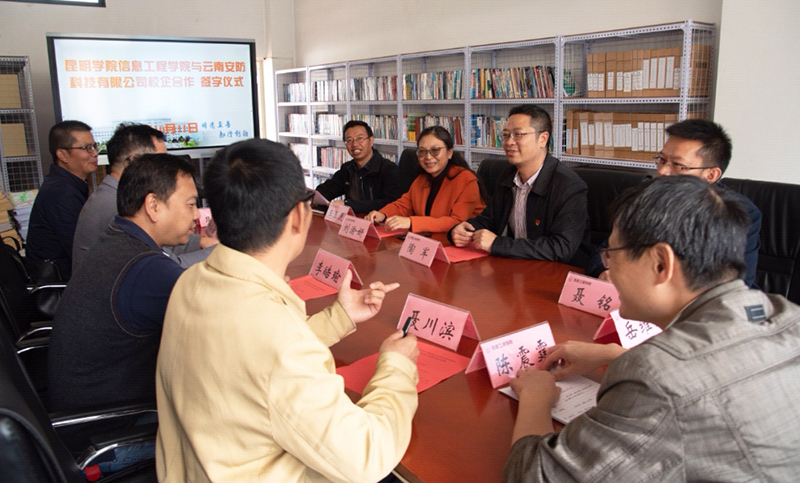 10月11日,信息工程学院与云南安防科技有限公司在惟实楼4301会议室举行了校企合作框架协议签字仪式。信息工程学院党委书记陶军、院长刘渝妍、副书记聂铭、副院长王玉见、教师代表岳维好博士和陈震霆博士,云南安防科技有限公司董事长兼总经理任兴平、副总经理李皓瑜、工程师夏川滨、许家云参加签约仪式。签约仪式由信息工程学院副院长王玉见主持。