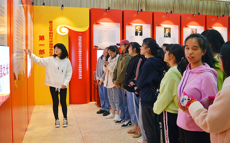 为深入学习贯彻习近平新时代中国特色社会主义思想,1124日,马克思主义学院在图书馆“习近平新时代中国特色社会主义思想学习园地”,开展“学习新思想、把握新时代”主题团日活动。我院习近平新时代中国特色社会主义思想学生宣讲团成员负责讲解,团总支书记对宣讲团学生进行指导,我院全体学生到场参观学习。
