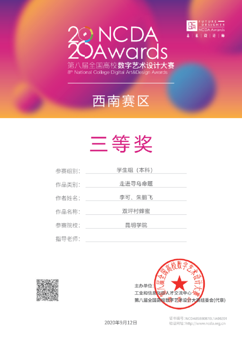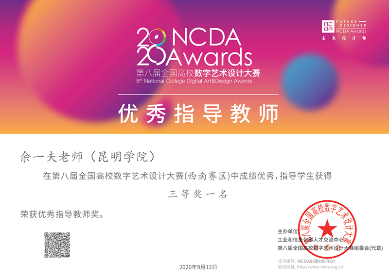 9月12日,在工业和信息化部人才交流中心主办的第八届全国高校数字艺术作品大赛(NGCA)比赛中,beat365英国官方网站建筑工程学院团总支书记余一夫老师荣获优秀指导教师奖,李可、朱鹏飞同学作品在“走进寻乌”命题赛中荣获西南赛区三等奖,张海滨同学在“走进耀州”命题赛中荣获西南赛区三等奖。