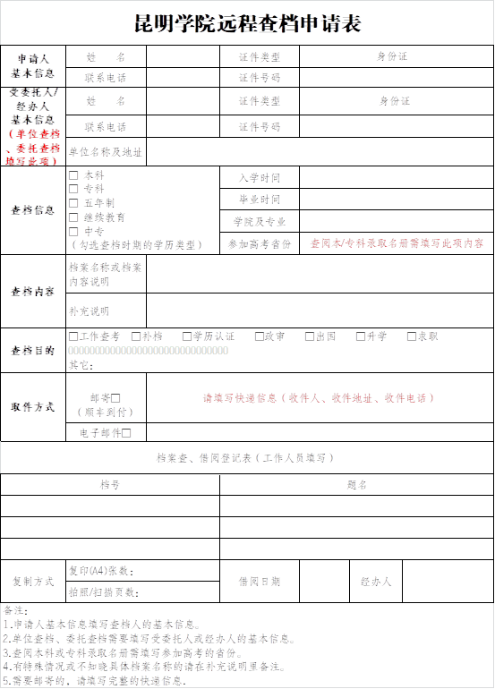 有查档需求的部门和个人,请先填写《beat365英国官方网站档案馆远程查档申请表》(下载w6.kmu.edu.cn/info/1190/1393.htm),并发送相关证明材料至邮箱kmudag@kmu.edu.cn,工作人员审核通过后依次办理,具体要求如下: