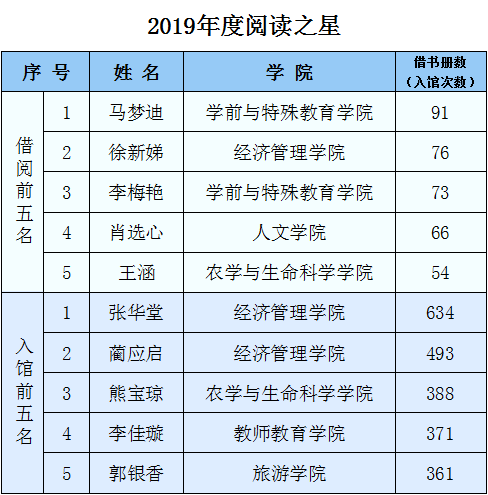 根据图书馆2019全年图书借阅和入馆次数排行,分别评选出本年度借阅图书总量排名前5和入馆次数排名前5的读者,授予“阅读之星”荣誉称号,并给予表彰,名单公布如下: