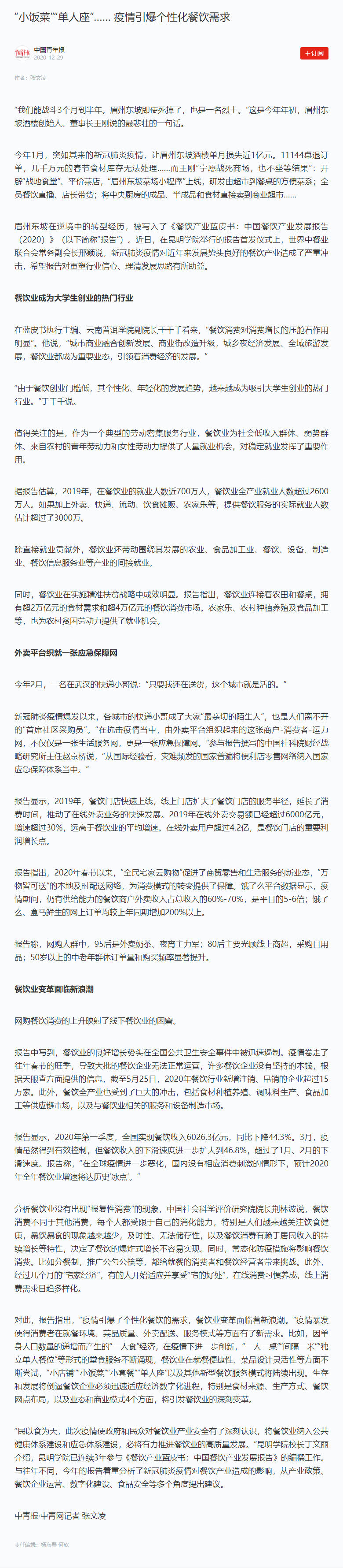 “小饭菜”“单人座”…… 疫情引爆个性化餐饮需求
