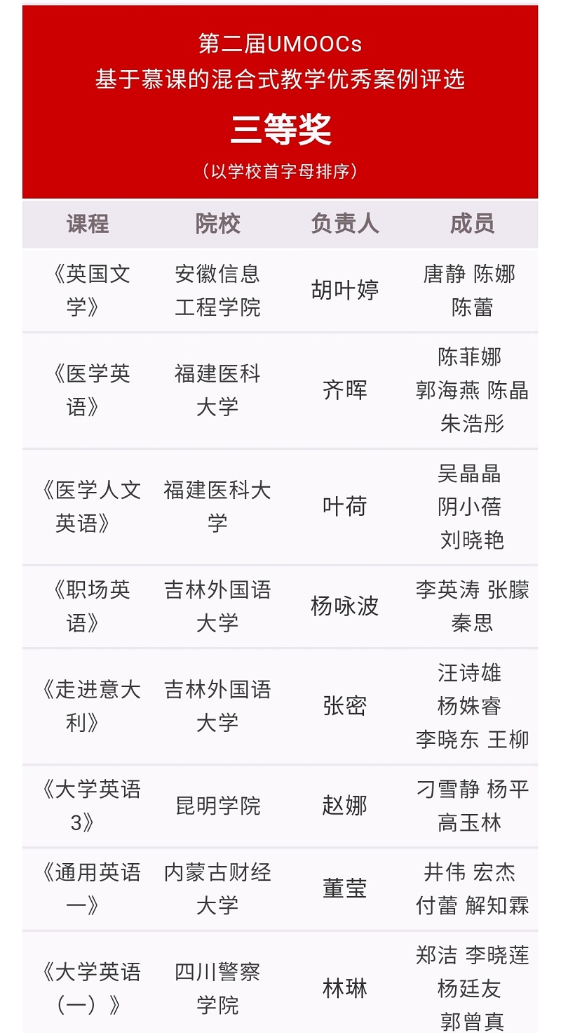 12月15日,外国语学院教学团队(赵娜、刁雪静、杨平、高玉林)申报的“《大学英语》(3)混合式教学优秀案例”在“第二届UMOOCs基于慕课的混合式教学优秀案例评选”活动荣获三等奖,成功入围全国30强。