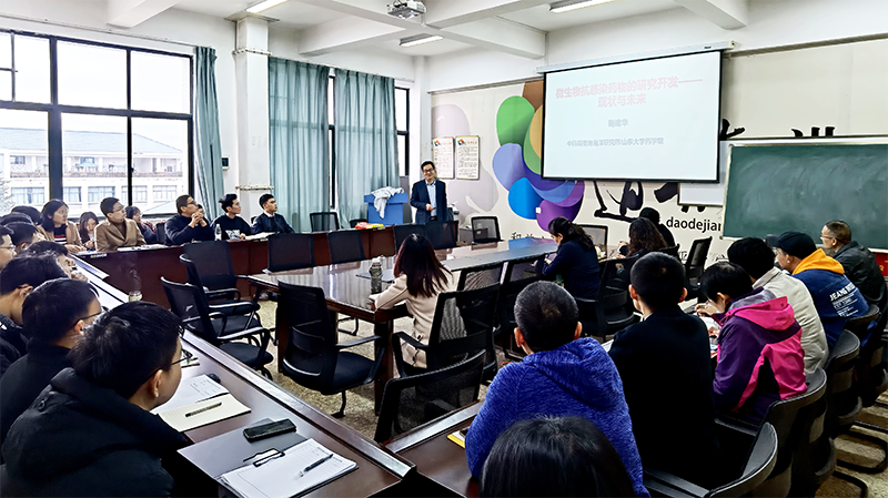 鞠建华教授主要介绍了微生物药物研究现状分析,海洋微生物来源抗感染先导化合物的发现和生物合成,包括抗结核、抗HIV、抗耐药菌类药物研究案例,并就《生物多样性公约》第十五次缔约方大会(COP15)的召开,激励我们科研工作者利用开发好地区特色生物宝库资源。在提问环节,鞠建华教授对学术和国家基金申报问题给予了耐心解答。鞠建华教授的到访,增进了学术交流并为国家基金项目申报提供了宝贵的意见和建议。