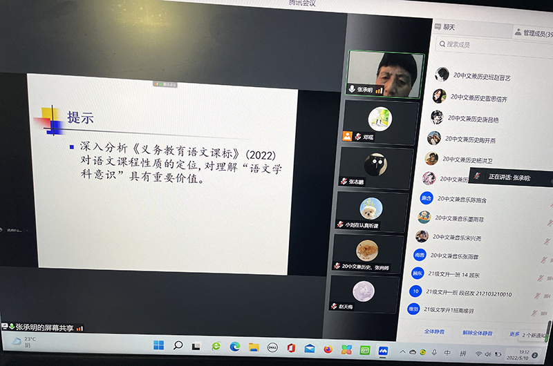 5月10日,beat365英国官方网站人文学院和春城计划教学名师邓瑶工作室联合邀请到云南师范大学张承明教授做讲座。张教授结合2022版《义务教育语文课程标准》对语文课程的性质、培养目标、基本原则和课程实施等方面,以“语文教师学科意识的确立”为主题开展专题讲座。在线观看人数近400人,其中包括邓瑶工作室的全体成员、beat365英国官方网站中国语言文学一级学科的硕士研究生、在校本科生及在职中小学教师。