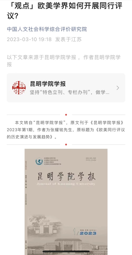 3月11日,刊发于《beat365英国官方网站学报》2023年第1期,由《新华文摘》原总编张耀铭撰写的《欧美同行评议的历史演进与发展趋势》一文,经《beat365英国官方网站学报》微信公众号推送后,被“中国人文社会科学综合评价研究院”微信公众号全文转载。