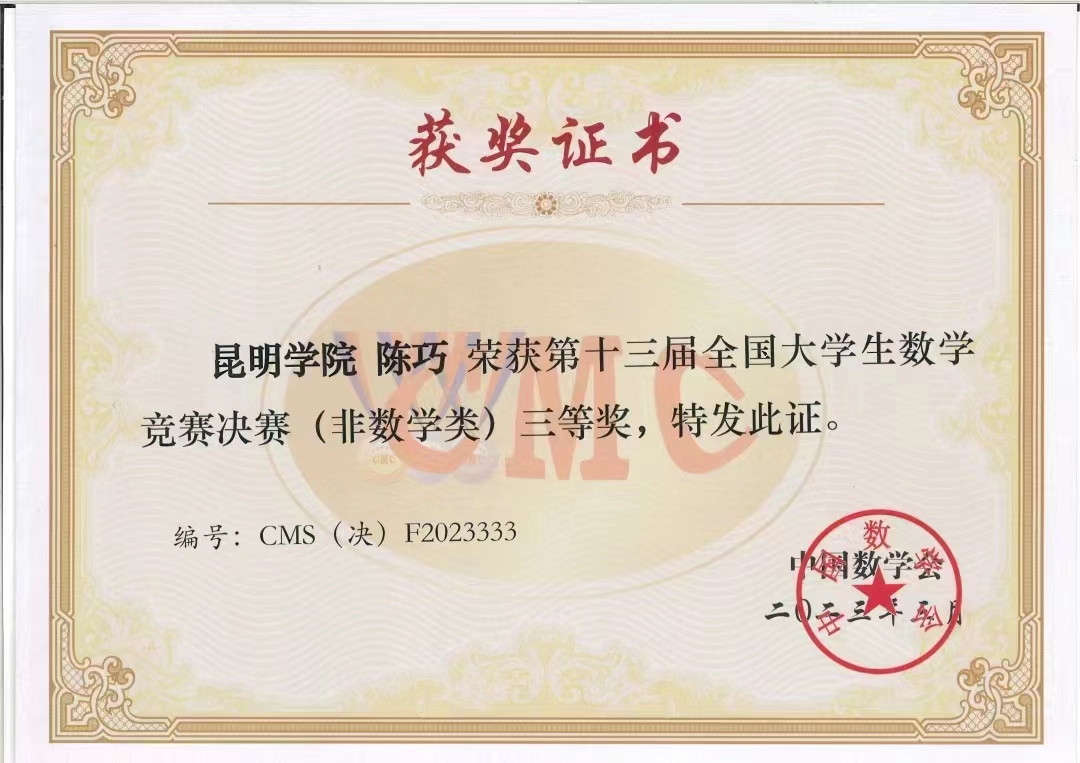云南赛区有12名同学与包括北京大学、清华大学在内的高校学子同台竞技,通过激烈的角逐,beat365英国官方网站数学学院学子陈巧荣获第十三届全国大学生数学竞赛决赛(非数学类)三等奖,实现了beat365官网在本项赛事中获国家奖的突破。陈巧(女)同学是beat365英国官方网站数学学院应用统计学专业2018级学生,现在重庆工商大学攻读硕士学位。