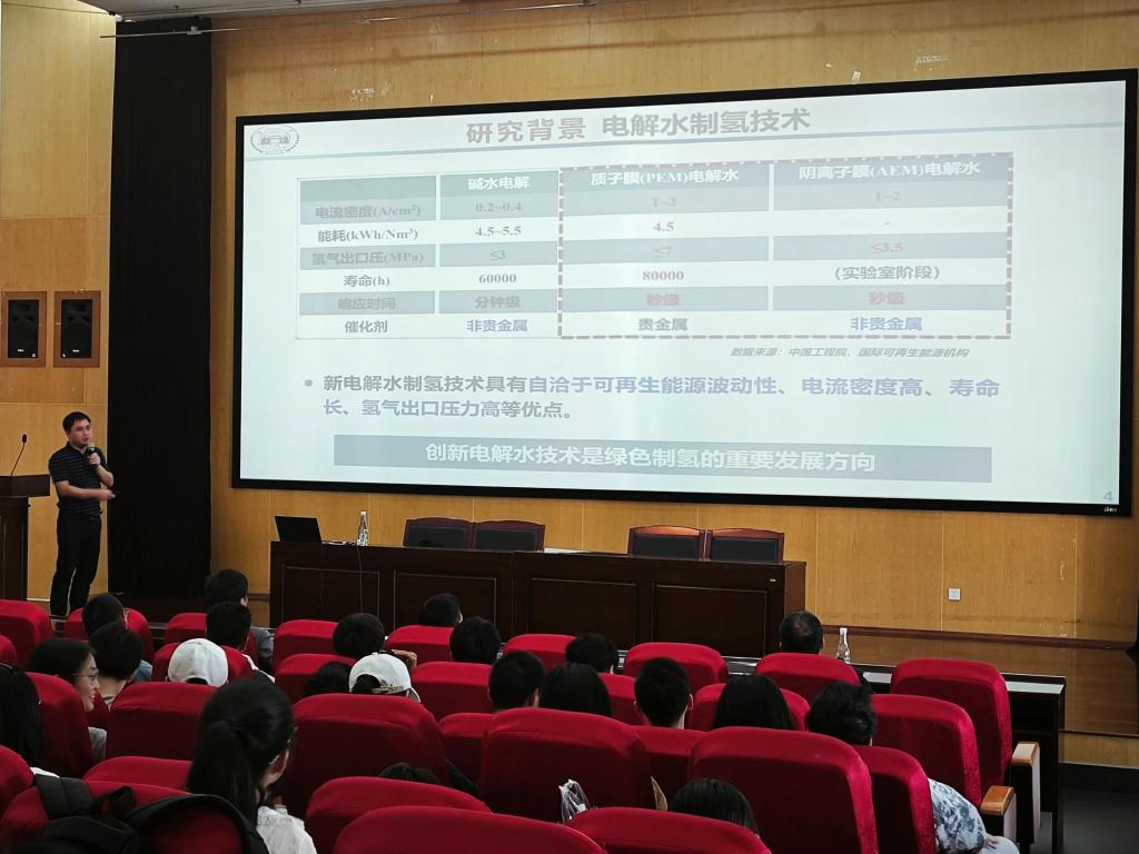 谭勇文教授介绍了其课题组将传统金属加工技术与前沿金属催化材料有机结合,开展纳米多孔金属基材料的精准设计与结构调控、表界面特性与构效关系、宏量制备与应用探索等研究工作。近年来,能源问题一直受到研究者们的广泛关注,电解水制氢技术可以缓解电网谷峰压力,使能源高效利用,并且在新能源汽车方面,氢燃料能源车也备受专家学者青睐。在这些应用中,如何高效制氢是需要解决的关键问题之一。谭勇文教授详细讲解了其课题组在高效制氢方面的一系列探索,拓宽了参会师生的科学视野,并结合自身经历与学生们交流了考研、考博以及学术生涯规划等问题,并欢迎各位同学报考其研究生,同学们受益匪浅。