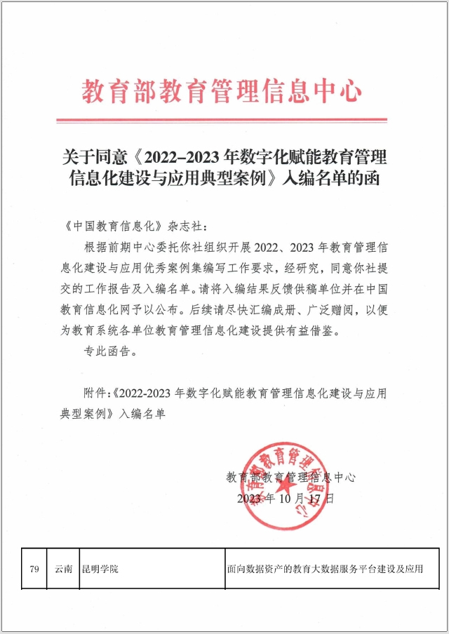 beat365英国官方网站依托学校数字校园建设成果,精心组织力量对学校教育大数据服务平台建设及应用工作进行总结凝练。经学校申报、教育厅推荐、教育部评审,最终作为云南省唯一高校项目入选案例名单。