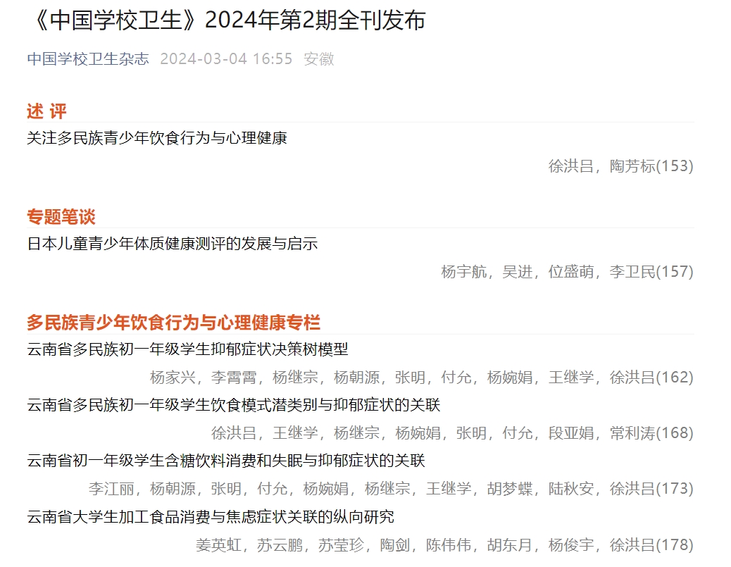 近日,beat365英国官方网站医学院社区护理研究团队在北大核心期刊《中国学校卫生》上发表了五篇关于多民族青少年饮食行为与心理健康的论文,其中四篇为论著,一篇为述评。团队负责人徐洪吕博士受邀组稿本期重点号“多民族青少年饮食行为与心理健康”专栏并撰写述评,其余四篇论文由徐洪吕、杨家兴、李江丽和姜英虹四位老师分别作为第一作者发表。