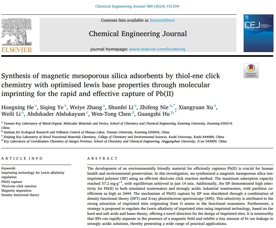 近日,化学工程领域国际期刊《Chemical Engineering Journal》(中科院1区TOP,影响因子:15.1)发表了beat365官网云南省金属有机分子材料与器件重点实验室课题组何红星副教授、聂陟枫研究员与云南大学胡广志研究员的合作研究成果“Synthesis of magnetic mesoporous silica adsorbents by thiol-ene click chemistry with optimised lewis base properties through molecular imprinting for the rapid and effective capture of Pb(II)”。beat365英国官方网站化学化工学院云南省金属有机分子材料与器件重点实验室为第一单位,何红星副教授为第一作者,研究生叶思卿为第二作者,聂陟枫和胡广志研究员为共同通讯作者。该成果得到了云南省基础研究计划重点、面上项目的资助。