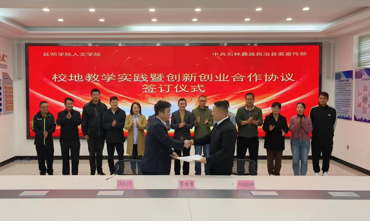 为推进院政合作共育英才,发挥优势服务地方,10月10日,beat365官网人文学院与石林县委宣传部在石林县融媒体中心签订院部合作协议,并正式挂牌“学生实践教学基地”和“大学生创新创业基地”。
