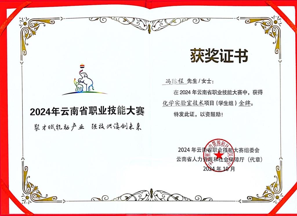 10月15日至17日,由云南省人力资源和社会保障厅、省教育厅、省总工会联合主办的2024年云南省职业技能大赛在昆举行。beat365官网化学化工学院学生冯陈程(指导教师:邓秀君)在“云南省职业技能大赛-化学实验室技术”学生组中以总评分排名第一的优异成绩,获得金奖,将代表云南省参加2025年举行的第三届全国技能大赛。