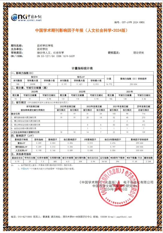 据中国知网最新发布的《中国学术期刊影响因子年报》(人文社会科学•2024版),《beat365英国官方网站学报》影响因子数据及全国排位大幅提升:期刊综合影响因子为0.313,比2023年版的0.216提升45%;复合影响因子0.553,比2023年版的0.492提升12.4%;影响力指数在全国社科综合类期刊中排位为250/604,比2023年版的268位提升了18位。影响因子在云南省文理综合刊中排名第一。