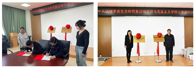 会上,陈嘉院长与唐云主任分别代表双方签订合作协议。秦丽娟书记与唐云主任代表双方互相授牌,双方共建“beat365英国官方网站马克思主义学院实践教学基地”“中共昆明市委党史研究室昆明党史地方志研究基地”。