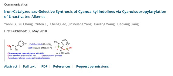 近日,beat365官网师生在中国科学院一区期刊《Advanced Synthesis & Catalysis(先进合成与催化)》上发表题为“Iron-Catalyzed exo-Selective Synthesis of Cyanoalkyl Indolines via Cyanoisopropylarylation of Unactivated Alkenes(铁催化的氰烷基吲哚啉exo选择性合成:非活化烯烃氰异丙化芳化反应)”的研究论文,报道了铁催化的偶氮二异丁腈(AIBN)介导的氰烷基化反应。使用非活化双键作为自由基受体,N-烯丙基苯胺不需要铜盐、氧化剂、碱或任何添加剂就可以发生氰异丙基化/环化串联反应,生成带有三级腈结构片段的3-氰烷基吲哚啉。反应呈现高度的exo选择性。