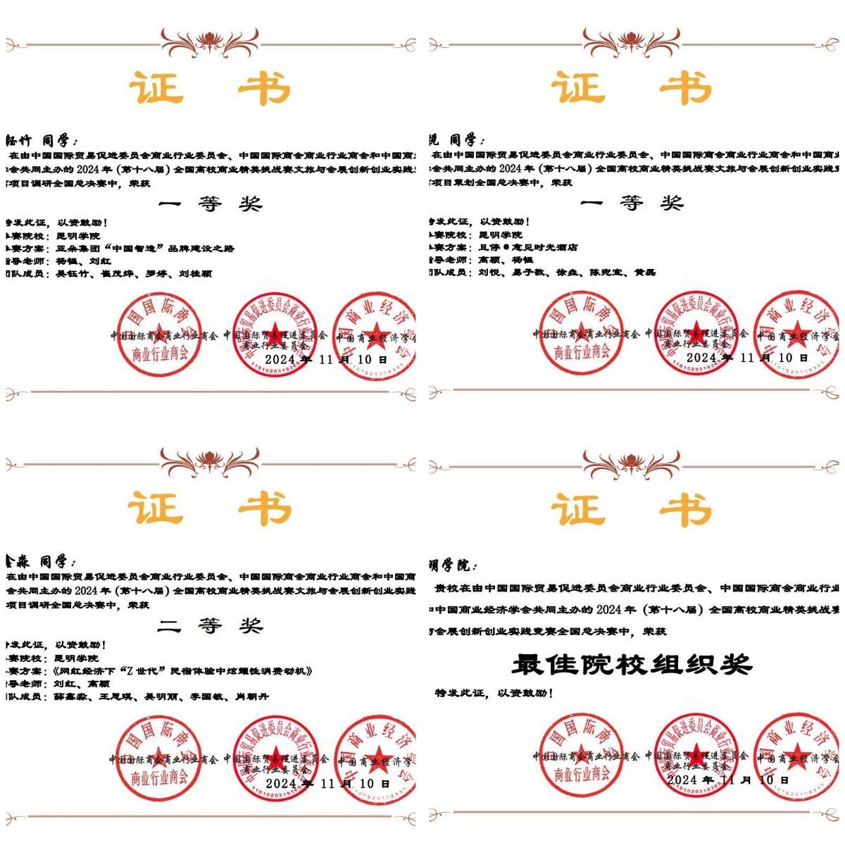 本次比赛由中国国际贸易促进委员会商业行业委员会、中国国际商会商业行业商会和中国商业经济学会联合主办。文旅与会展创新创业实践竞赛,已连续多年被纳入学科竞赛排行榜,是目前商科教育领域文旅与会展方向唯一纳入该榜单的国家级赛事。竞赛设置初赛(校赛)、复赛(省赛)、全国总决赛分组赛、全国总决赛精英赛分组赛、全国总决赛精英赛冠亚季争霸赛五个阶段。初赛阶段共吸引了来自全国31个省(市、自治区、直辖市、特别行政区) 756 所高校12000支队伍60000余名学生报名参加。566所高校4788支参赛队伍28344名参赛选手和辅导教师,进入全国总决赛分组赛。赛事启动以来,旅游学院高度重视,积极组织学生参加培训,9月份在云南省赛区获得省赛一等奖1项、二等奖2项,入围全国总决赛。本次竞赛取了优异的成绩,展现了参赛同学出色的创新能力和卓越的专业素养,同时也是旅游学院重视学生创新能力培养的体现。