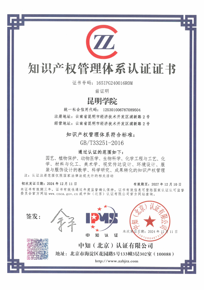 2023年底,学校获批云南省首批专利转化专项计划项目,为响应国家号召,全面提升学校的知识产权管理水平,强化知识产权保护意识,依托该专利转化项目,学校启动了知识产权“贯标”工作,在建设过程中,学校积极筹备、稳步推进,成立专门的知识产权贯标认证工作小组,精心制定工作方案,细致梳理认证体系,并认真组织内部审查。通过近一年的努力,学校成功将知识产权工作深度融入科学研究、科研管理以及成果转化的各个环节,编制了知识产权管理手册、管理制度等一系列规范性文件,逐步形成一套符合国家标准且适应beat365官网特色的知识产权制度体系和管理模式。