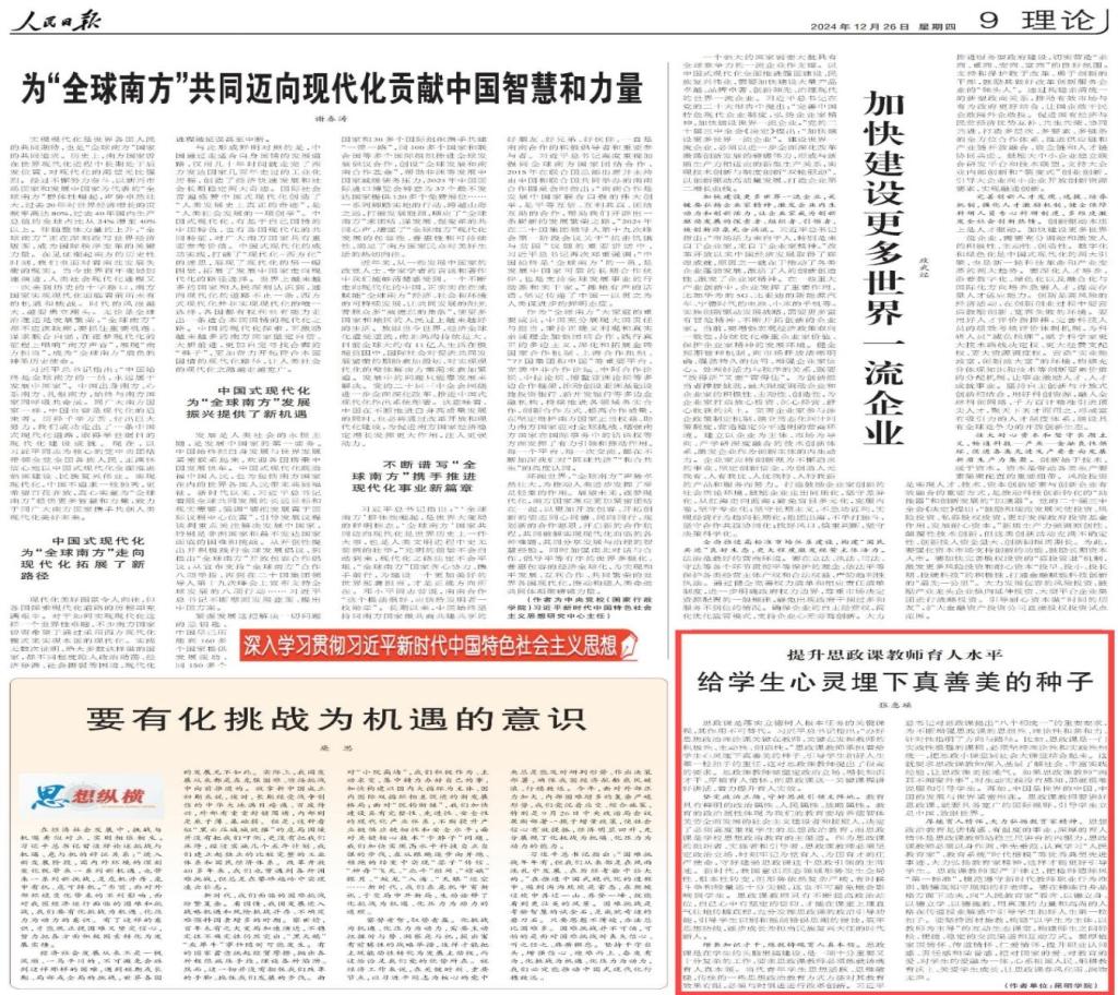 12月26日,马克思主义学院教师张惠瑶博士在《人民日报》理论版发表文章《给学生心灵埋下真善美的种子——提升思政课教师育人水平》。文章指出,思政课是落实立德树人根本任务的关键课程,思政课教师承担着给学生心灵埋下真善美的种子、引导学生扣好人生第一粒扣子的重任。从坚定政治立场、增长知识才干、厚植育人情怀三个维度提出了提升思政课教师育人水平的对策建议。文章被求是网、人民网、光明网等媒体转载。