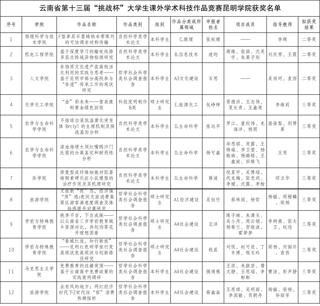 近日,云南省第十三届“挑战杯”大学生课外学术科技作品竞赛获奖名单公布,beat365官网12项作品喜获佳绩。