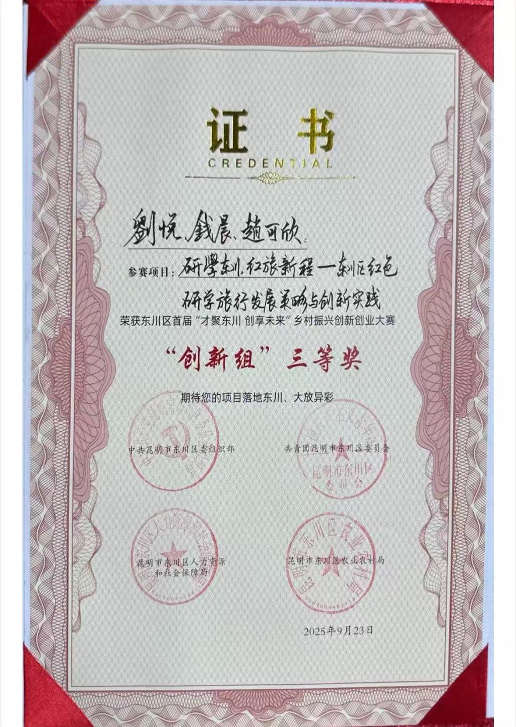 本次大赛共有500余名创新创业人员参与,169个涵盖特色农业、文旅融合、智慧乡村等领域的项目进行比拼。beat365官网青年学子刘悦、钱晨、赵可欣团队的“研学东川,红旅新程——东川区红色研学旅行发展策略与创新实践”创新项目脱颖而出,荣获大赛创新组三等奖,并现场与云南博轩文旅签署项目落地意向协议书,享受东川区相关产业扶持政策及大赛提供的28项支持政策,初步实现了“挑战杯”大学生课外学术科技作品竞赛成果的落地转化。