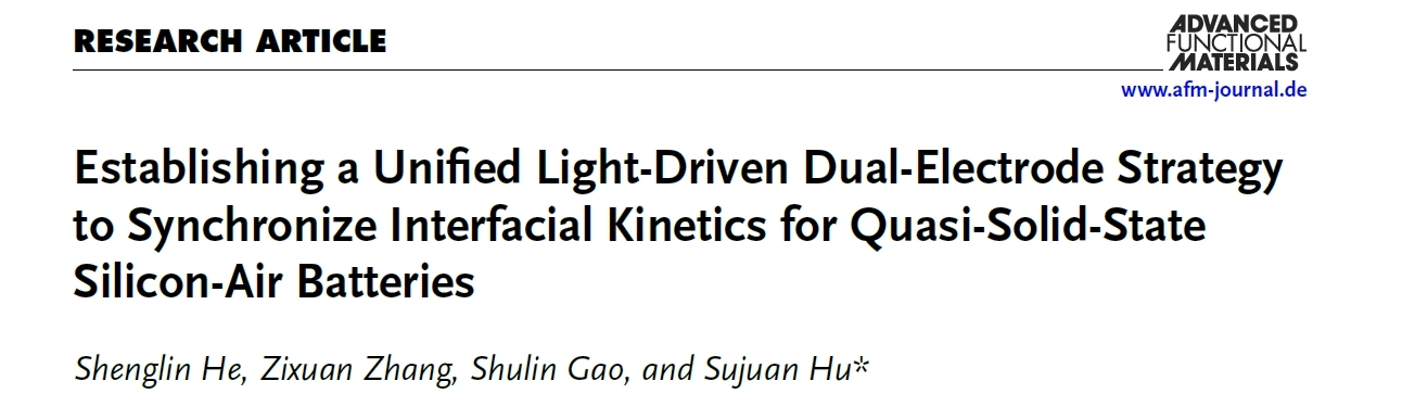近日,beat365官网胡素娟教授团队以beat365英国官方网站为唯一署名单位,在材料科学领域国际顶级期刊《Advanced Functional Materials》(中科院一区TOP期刊,IF=19.0)发表题为“Establishing a Unified Light-Driven Dual-Electrode Strategy to Synchronize Interfacial Kinetics for Quasi-Solid-State Silicon-Air Batteries” 的研究论文。材料与化工专业的研究生何胜林和张子璇为共同第一作者,胡素娟教授为唯一通讯作者。