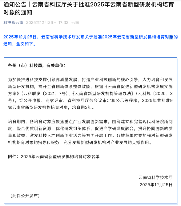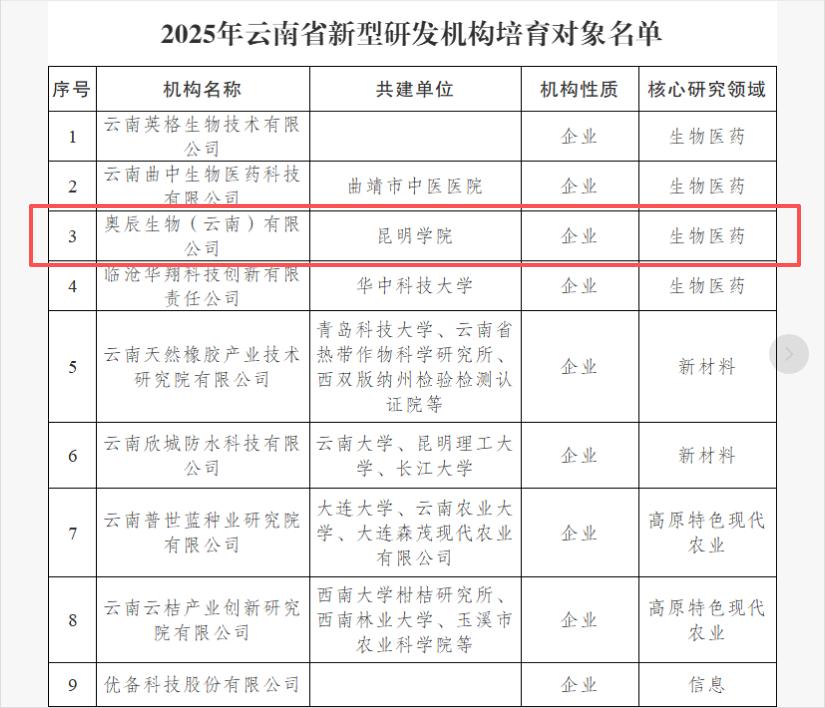 12月26日,云南省科技厅发布《云南省科技厅关于批准2025年云南省新型研发机构培育对象的通知》,beat365英国官方网站医学院秦静副教授团队与奥辰生物(云南)有限公司潘兴华教授团队联合申报的“生物医药”领域新型研发机构成功获批,这标志着beat365官网在深化产教融合、服务地方生物医药产业发展方面取得了又一重要突破。