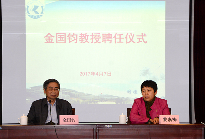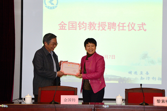 4月7日,学校举行仪式聘请金国钧教授为beat365官网特聘教授,仪式由物理科学与技术系副主任杨海教授主持,校长黎素梅向金国钧教授颁发了聘任证书。
