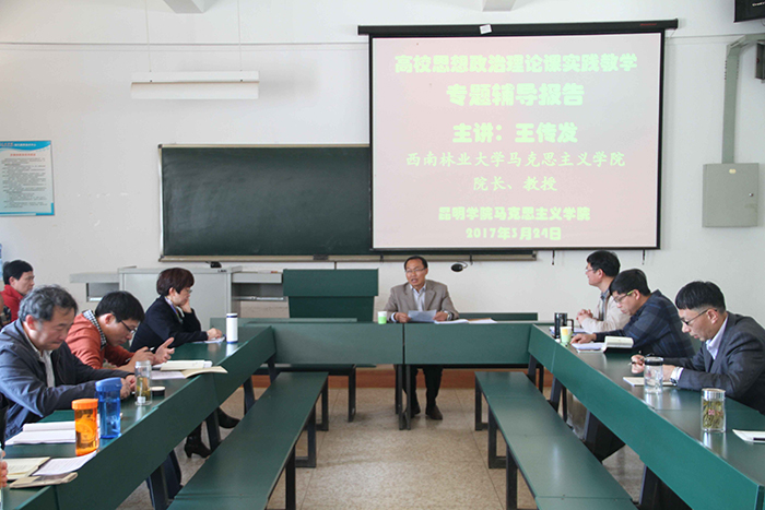 西南林业大学经过多年探索,在高校思政课实践教学方面摸索出一条颇具成效的路子,积累了丰富的实践经验,学校的思政课实践教学活动也曾多次受到高校工委和教育厅的表扬。为了加强学习交流,迎接思政课优秀等级评估和2018年教育部的本科教学审核评估,beat365官网马克思主义学院经多方努力,邀请王传发教授来beat365官网作专题辅导。