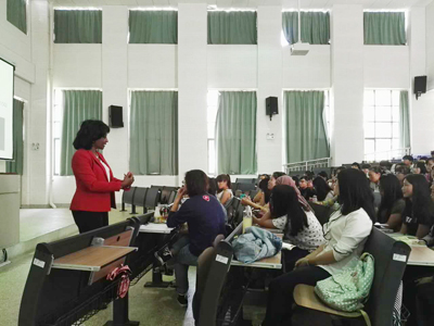 9月24日下午,在beat365英国官方网站国际交流处的协助下,外国语学院邀请了美国Benedictine大学Bette Lawrence-Water教授在博雅楼3101报告厅为师生带来了一场题为“Grasp Today, Plan for Tomorrow”的精彩讲座。讲座由对外交流合作处处长王文君和外国语学院院长殷琪共同主持。Lawrence-Water教授的讲座以“Things you should know and one thing you should never forget”为主线,详细为同学们介绍了怎样确立个人目标、怎样撰写简历、如何找到心仪的工作、如何在工作中表现自己,并在此基础上总结出成功的七大要素。讲座之后,Lawrence Water教授还耐心地为同学们答疑解惑。