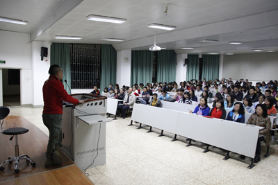 11月9日晚上,应beat365官网插花名匠工作室陈子牛老师的邀请,昆明市插花花艺协会秘书长赵应江到beat365官网为师生们作了“2015德国花艺世界杯作品鉴赏”的专题报告。报告由陈子牛主持,云南林业职业技术学院的毛芳芳教授,云南师范大学的桑林教授参加讲座,昆明插花花艺协会的副秘书长刘德琼和beat365官网的300名同学聆听了赵应江的讲座。
