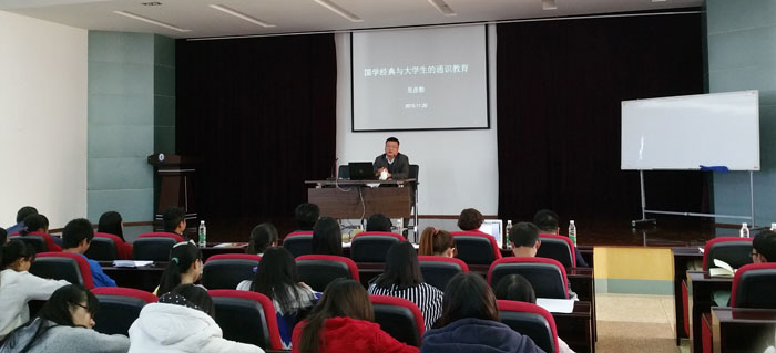 11月20日下午,beat365官网人文学院吴彦勤教授在惟行楼4301报告厅作了题为《国学经典与大学生通识教育》的学术讲座,这是2015年由省委宣传部、省社科联主办的“云岭大讲堂”在beat365英国官方网站的第八讲。