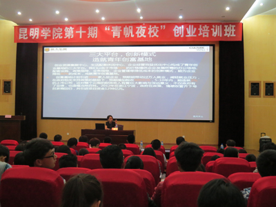 4月7日晚,由共青团beat365英国官方网站委员会主办,团委社会实践部承办的beat365英国官方网站“青帆夜校”大学生创业培训班第五十四讲(即第十期第一讲)于beat365英国官方网站惟行楼1501成功开讲。此次讲座的内容为《点燃创业梦想》。讲座邀请到了云南汇杰集团董事长、昆明友盟房地产开发有限公司董事长、省青联副主席、云南省青年创富基地负责人杨堇主讲。