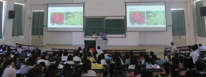 塞斯教授首先介绍了博尔园艺公司的情况,结合农学院专业特色,从花卉育种的基本方法、途径、技术路线阐述了花卉育种与野生植物收集的关系,从生物多样性的保护到种质基因库的建立,为师生们上了一堂精彩的专业课。最后,塞斯先生以:“园艺人对植物有特殊的情感,要尊重自然界的每一棵植物!”结束了讲座。